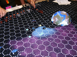 Before the game began, I had the players divide into two teams of four each: the attackers (the noble liberators/heartless oppressors of the Terran Transsolar Federation) and the defenders (the freedom fighters/criminal revolutionaries of Nova Liberia).